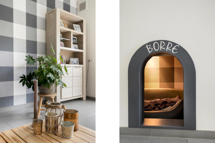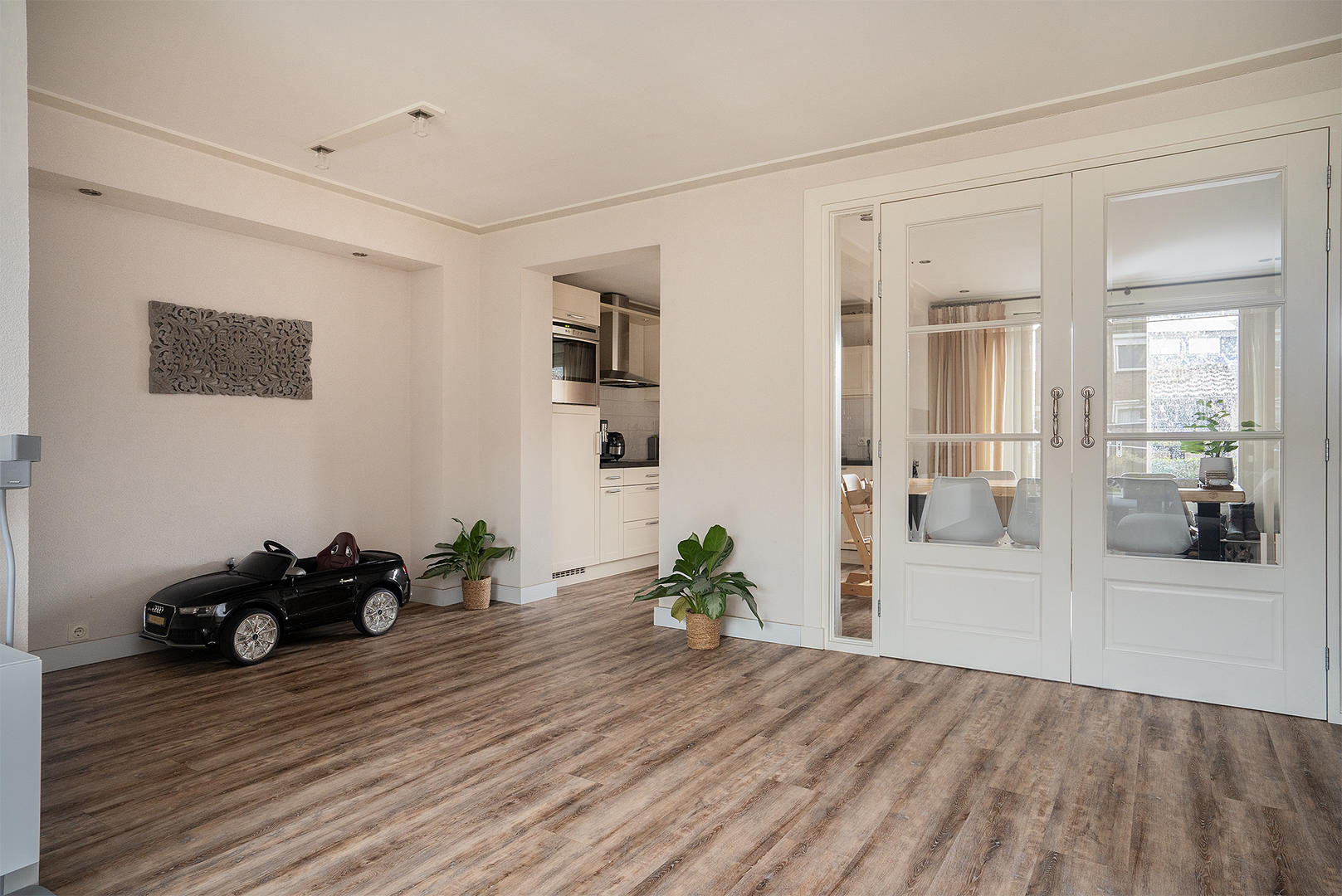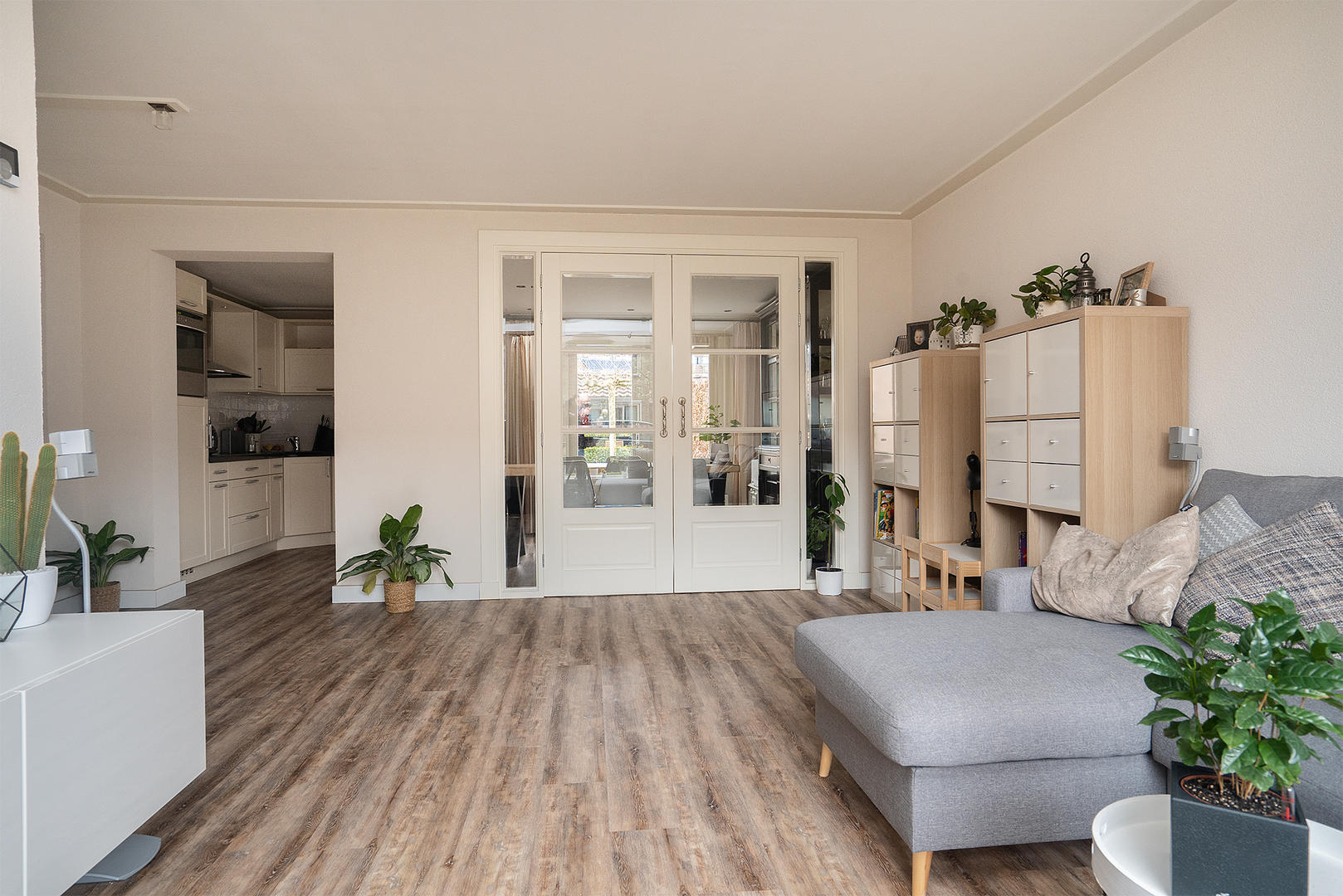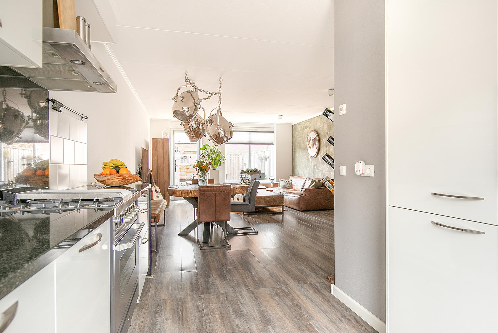 Entree, hal, ruime woonkamer met schouw, vaste kast, veel natuurlijke lichtinval en vrij uitzicht.